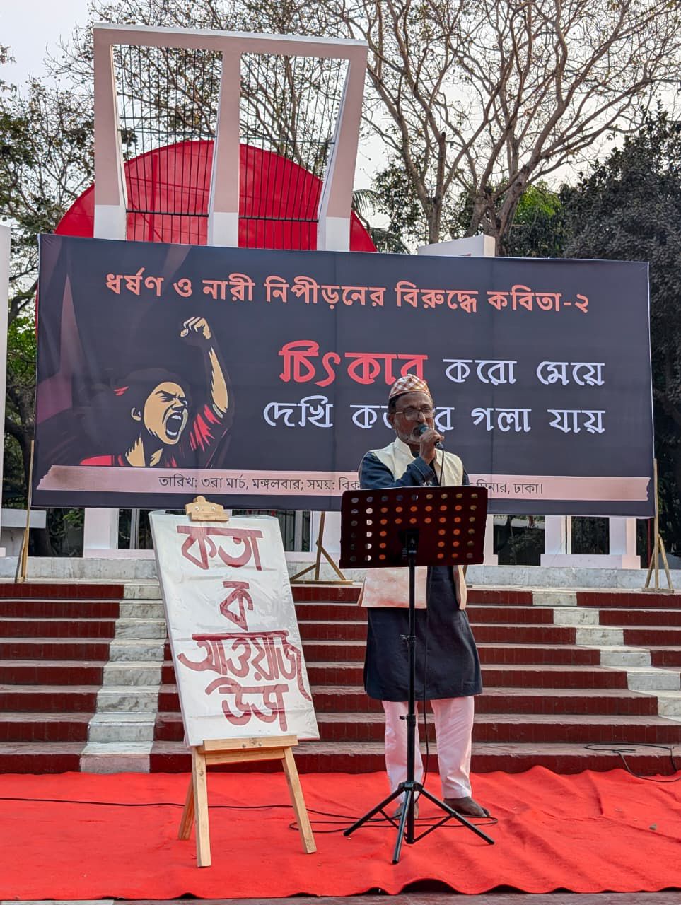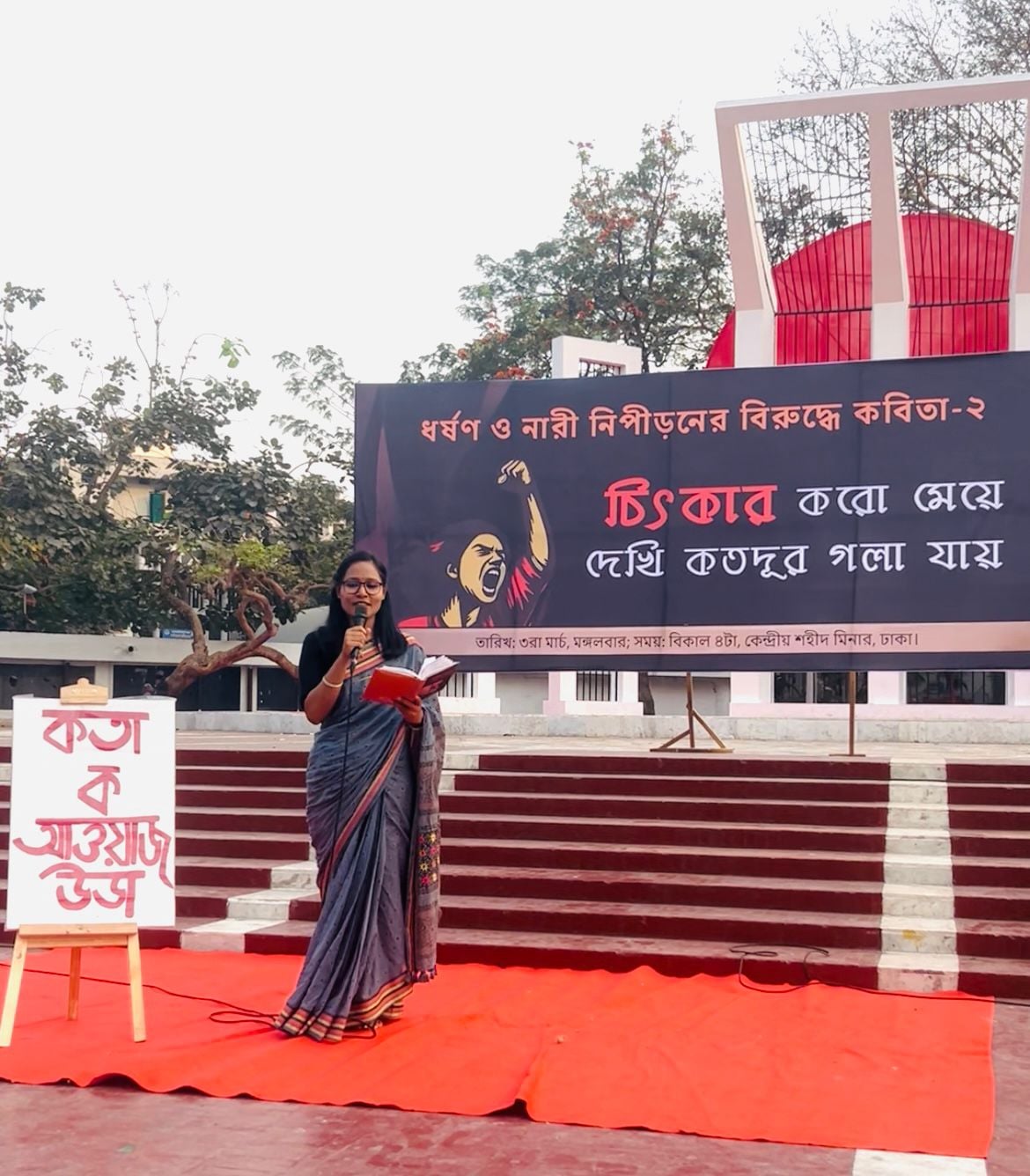 “চিৎকার করো মেয়ে, দেখি কতদূর গলা যায়”- স্লোগানে মঙ্গলবার (৩ মার্চ) বিকাল ৪টায় কেন্দ্রীয় শহীদ মিনারে অনুষ্ঠিত হয় এই প্রতিবাদী আবৃত্তি আয়োজন।