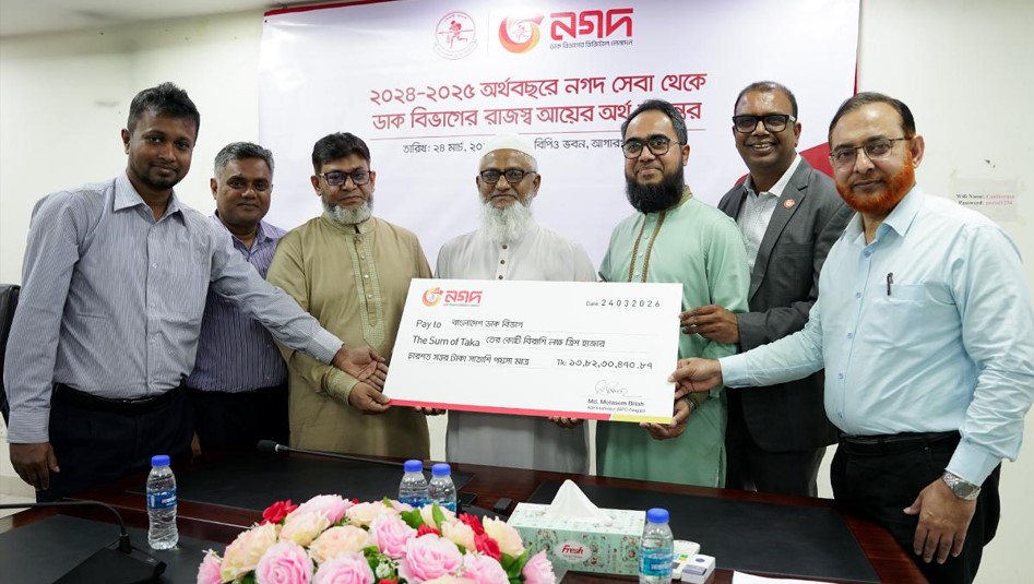 রাজধানীর আগারগাঁওয়ে ডাক ভবনে মঙ্গলবার আয়োজিত এক অনুষ্ঠানে ডাক অধিদপ্তরের মহাপরিচালক কাজী আসাদুল ইসলামের কাছে ১৩ কোটি ৮২ লাখ ৩০ হাজার ৪৭০ টাকার চেক হস্তান্তর করেন নগদের চিফ ফাইন্যান্সিয়াল অফিসার আফজাল আহমেদ। ২০২৪ সালের জানুয়ারি থেকে ২০২৫ সালের জুন পর্যন্ত সময়ের রেভিনিউ থেকে এ অর্থ প্রদান করা হয়।