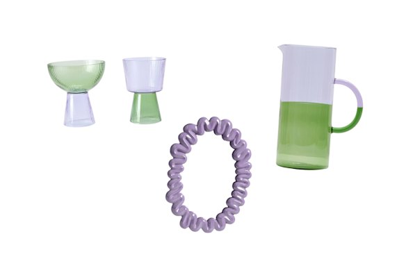 Where to buy: Yinka Ilori glasses, $150 (set of two); &Klevering “Dribble”mirror, $176; KEY PIECE Fazeek’s two-tone pitcher ($149) combines green and lilac to stunning effect.