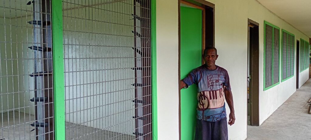 Phinehas Gura posing in side of the new Laugwata classroom building.